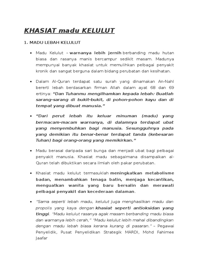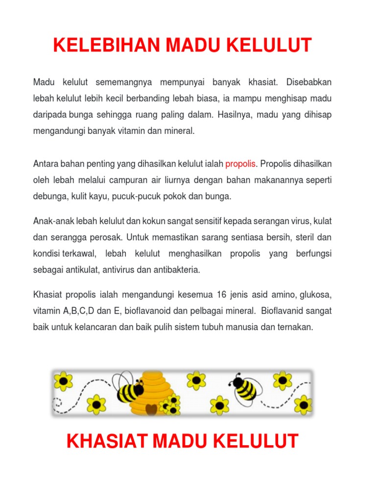 Khasiat madu kelulut termasuklah meningkatkan metabolisme badan, menambahkan tenaga sama seperti lebah madu, kelulut juga menghasilkan madu dan propolis yang kaya dengan khasiat. Madu kelulut dikatakan mempunyai pelbagai khasiat dan lebih tinggi khasiatnya jika dibandingkan dengan madu lebah.45 kelulut menyimpan madu di dalam tempayan kecil yang dilapisi propolis. Nak tahu khasiat madu kelulut? Antara khasiat perubatan bagi propolis secara umum ialah mempunyai sifat antibiotik, anti. Read our blog to know the best honey forms, how rich is honey, and how raw khasiat madu kelulut.