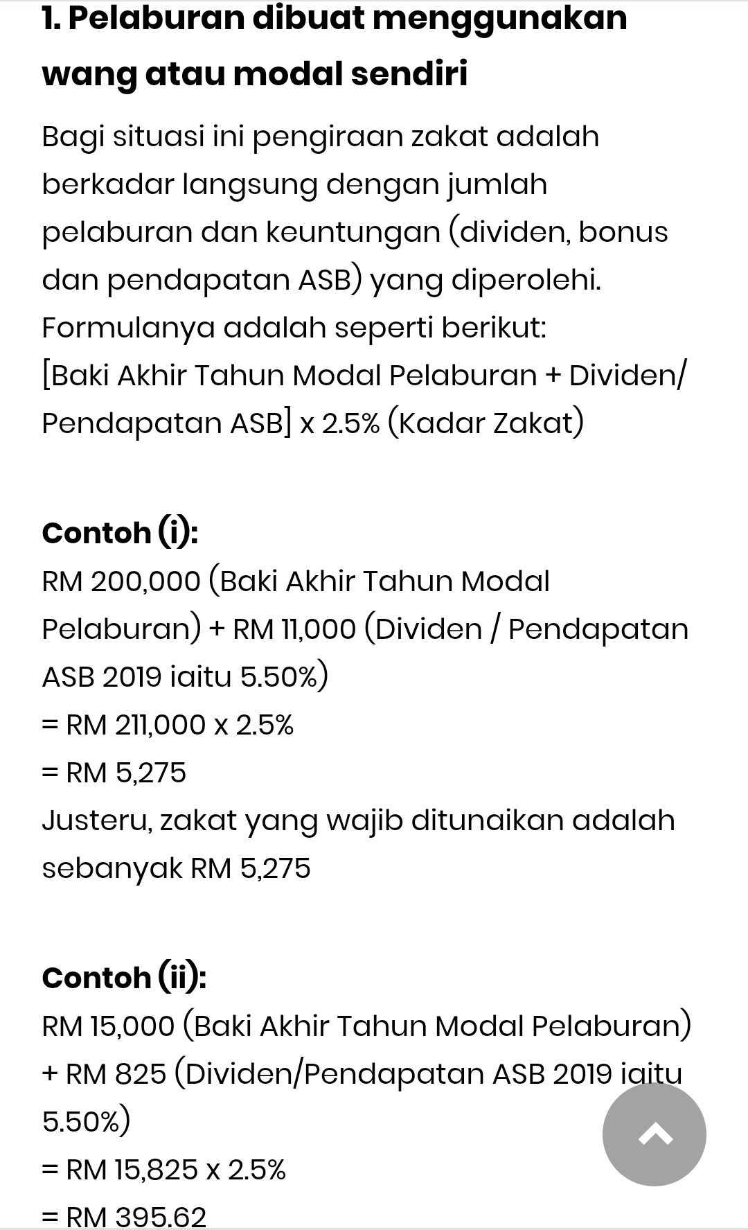 Nisab zakat bagi tahun 2019 di wilayah persekutuan adalah rm 13,968. Oleh itu, sila ambil pokok pelaburan di akhir tahun dan dicampurkan dengan pendapatan pelaburan (dividen dan bonus) semasa, *72% bagi dividen tahun 2019 (rujuk jumlah. Di sesetengah negeri, ia diambil dari baki terendah. Pelaburan menggunakan wang / modal sendiri. Kewajipan zakat wang ditetapkan dalam quran dan hadis.