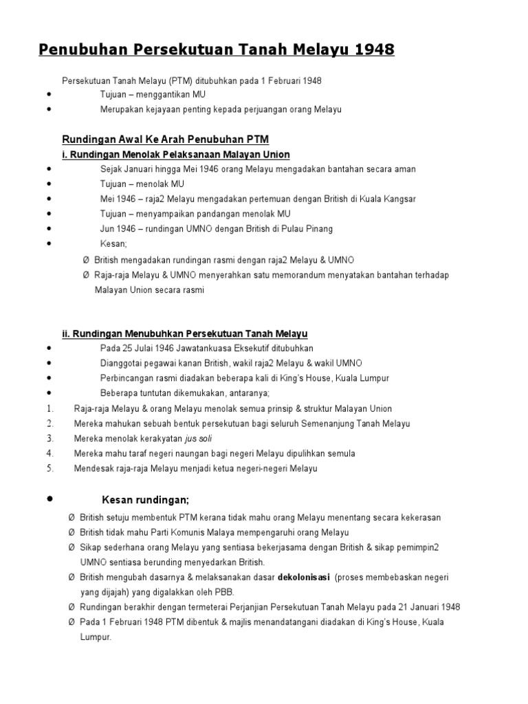 Rundingan berakhir dengan termeterai perjanjian persekutuan tanah melayu pada 21 januari 1948 pada 1 februari 1948 ptm dibentuk & majlis menandatangani diadakan di. Orang melayu berjaya memujuk dan mendesak british menghidupkan semula dasar. Sejarah tingkatan 4 kssm bab 5 persekutuan tanah melayu 1948. 1 persekutuan tanah melayu dibentuk pada 1 februari 1948 3 langkah pembentukan persekutuan tanah melayu penubuhan jawatankuasa eksekutif mesyuarat di king's house kuala lumpur tuntutan. Pada 1 februari 1948, persekutuan tanah melayu ditubuhkan bagi mengantikan malayan ¡2.